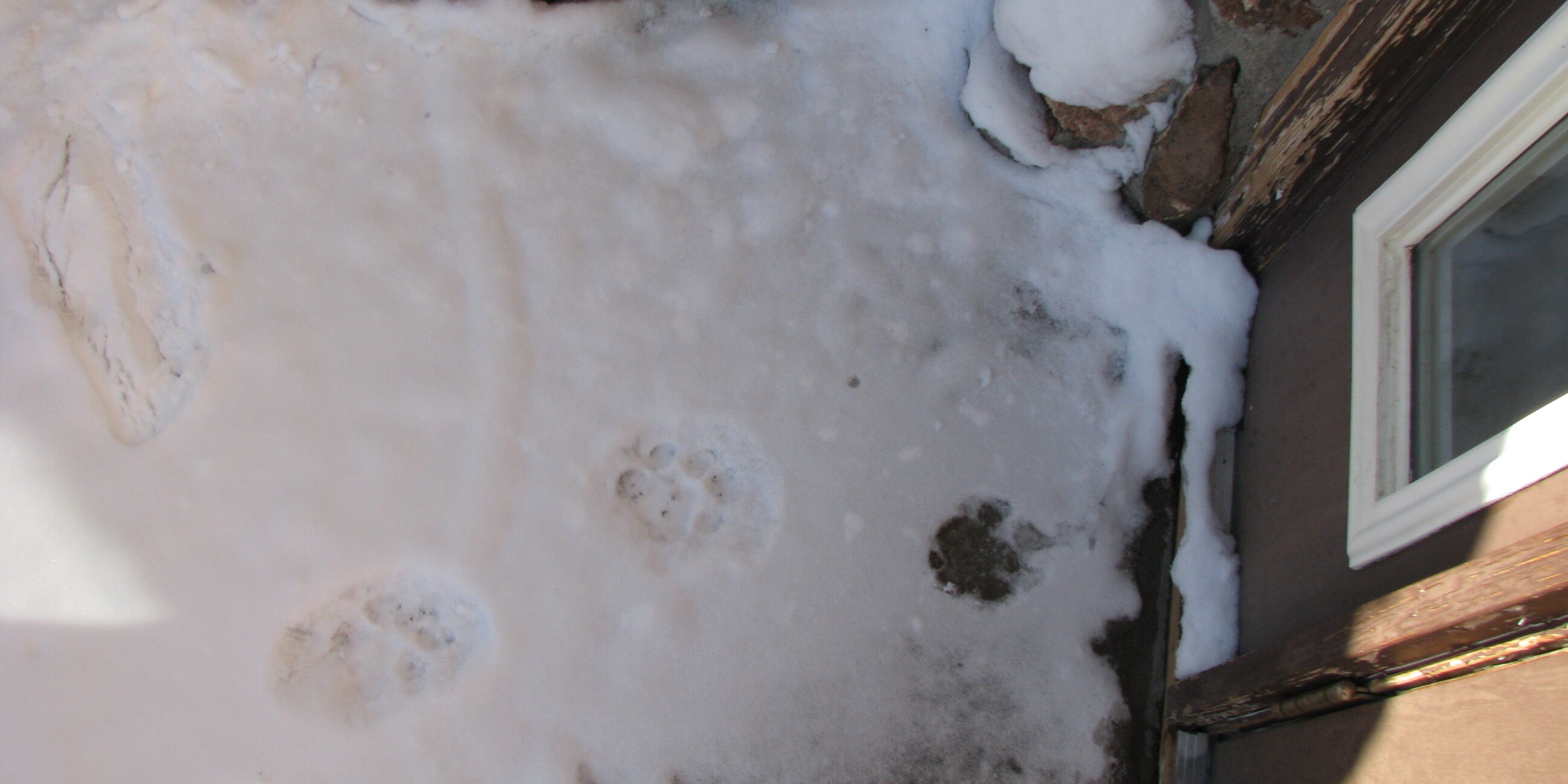 The wind came up overnight and refreshed the snowy canvas, and by the next morning my bulky footprints from the evening before had been erased. A fresh line of oval pawprints, which I initially took to be the coyote looping past again, lead up to the house. When I went out on the deck for a closer look, however, it was obvious that the tracks had been left by a feline, not a canine. A very large feline.