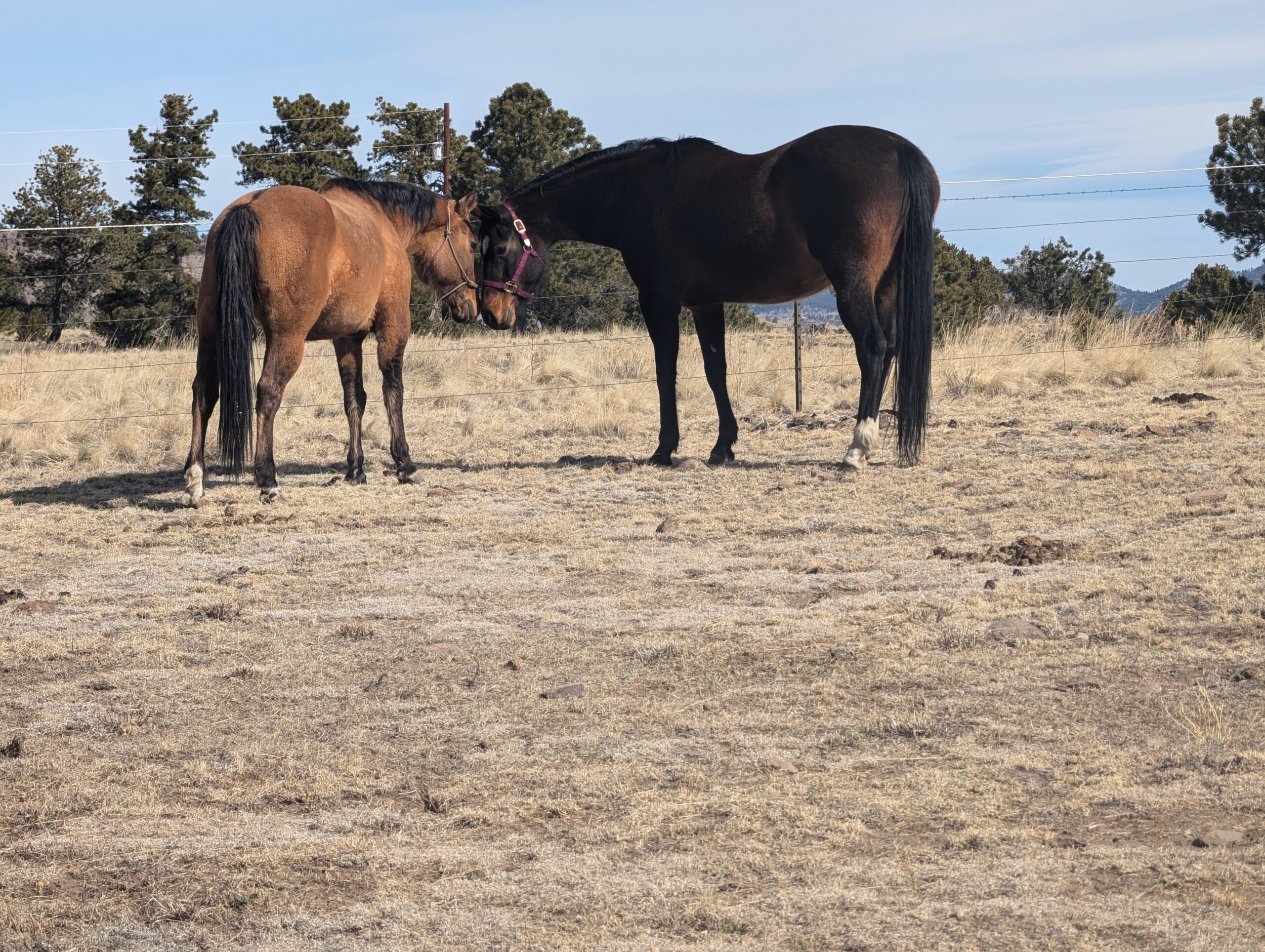 Harper is, these days, Boss Mare. Although she often wields her authority in a manner I don’t agree with, she does adore a schedule. When 5 p.m. rolls around, she is waiting, and Dunlin, her new pasture-mate, is patiently standing nearby. There may be days when Harper’s in a snit because I’m running ten minutes late or the two of them are running laps up and down the fenceline, bucking and farting in the wind, but I have not had to go fetch horses since Moondo died in 2020.